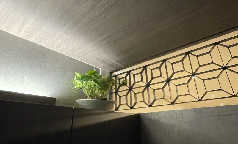 個人邸のキッチンとリビングをつなぐ間仕切り壁に、金属製の四方升意匠欄間を設置。
